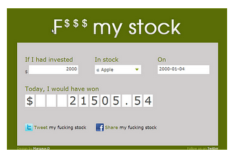 Voici un site intéressant : F$$$ My Stock, pour les CeuZes qui n'ont pas investi, mais qui voudrait vérifier comment ils auraient pu gagner ou perdre sur un ou plusieurs titres donnés. Il vous sera possible de publier vos gains ou vos pertes virtuels sur Twitter ou Facebook!