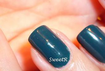 C'est un vernis que je n'arrive pas à définir par rapport à sa zone de couleur. Vert ? Bleu ? Je dirais que c'est vraiment un très beau compromis entre les 2. Qu'on soit à la lumière, moins exposée, au flash, sans flash, lumière artificielle ou lumière du jour, l'intensité de la couleur varie. Ce qui explique que sur mes photos, ce ne sera pas toujours la même teinte (j'adore ça !)