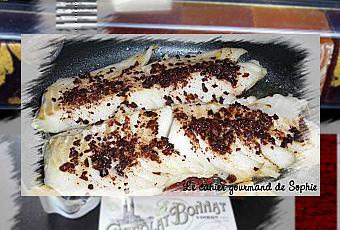 Pendant les vacances de la Toussaint, j'ai assisté à un cours à l'Atelier des Chefs à Dijon, et voici donc la recette que nous avons fait. Un plat salé, oui, mais quand même avec du grué de cacao; je n'ai pas choisi mon cours au hasard !! Le résultat est vraiment parfait, c'est vite fait et très bon : le grué de cacao apporte une petite touche craquante qui s'accorde bien avec le poisson. J'ai déjà refait ce plat plusieurs fois à la maison depuis !