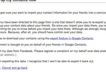 Lorsque vous tenterez d’exporter vos contacts Gmail depuis Facebook, Google vous redirige vers une page Web vous prévenant du «danger» d’exporter vos données chez Facebook. Google ne vous empêchera pas d’exporter vos données, cependant cette page veut évidemment vous dissuader de le faire. Vous trouverez cette page ici.