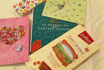 Second colis envoyé par Herisson :) Bon j'avoue il y avait plus de bonbons Harlequin dedans, mais entre l'ouverture et la photo, je n'ai pas pu résister. Je suis faible je sais. Et sinon, ils accompagnaient un bloc-notes à l'effigie du Petit Nicolas. Et bien sur 84 , Charing Cross Road d'Helen Hanff qui fait écho à l'envoi de Tiphanie :)