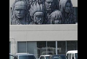 Le rocher des Hokage de Konoha sur un bâtiment de la ville de Naruto