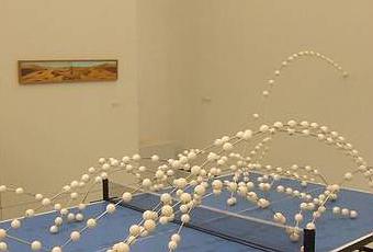 Le Musée d’Art Moderne et Contemporain de Strasbourg expose (jusqu’au 13 février) tous les artistes sélectionnés pour le Prix Marcel Duchamp depuis sa création, 43 représentants de la fine fleur de l’art contemporain français. De plus critiques que moi feront l’analyse des pertinences et des bizarreries de cette sélection, c’est presque trop facile de souligner les absences flagrantes, l’abondance de peinture souvent médiocre, les artistes trop peu matures présentés trop vite, trop tôt : je me tais. En même temps, comme les oeuvres présentées ici appartiennent toutes à des collections privées, cette exposition est aussi un reflet de l’écart entre goût privé et goût public, et là aussi, une analyse plus fine de cet écart serait intéressante. Il y a peu, lors d’un colloque sur la photographie contemporaine française, Pierre Leguillon (entre autres, collectionneur de magazines avec des photos de Diane Arbus) détaillait (à la hache) les catégories ayant eu une influence prépondérante dans l’art contemporain : dans les années 1950 : le critique, les années 1960/1970 : l’artiste, les années 1980 : le galeriste, les années 1990 : le curateur et les années 2000 : le collectionneur…Peut-être… Vue de l’exposition avec Richard Fauguet (’Sans titre (table de ping-pong)’, 2000-2004) et, au mur, Philippe Mayaux (’La perte de vue des illusions I, Fata Morgana‘, 1991).