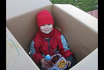 Non! Non! N'appelez pas la D.P.J. ou la police, c'est une idée de fiston... Nous étions à ranger le cabanon en prévision de notre prochain déménagement hivernal (quelle idée aussi de déménager en février!) quand mon fils s'est fait plus discret, il avait trouvé sa cabane!Il a même demandé d'y prendre sa collation et tout alla super bien jusqu'à ce que sa soeur décide elle aussi d'y entrer!La cohabitation fut pourtant heureuse jusqu'au moment oùla boîte a tombé sur le côté...Pff!!!