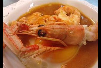 Un oeuf, un plat, des langoustines et une sauce américaine.