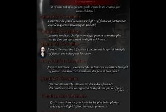 Découvrez le programme de la longue semaine d'anniversaire du site twilight vef france qui est en vue ! :) Tout au long de la semaine vous découvrirez des articles inédits, des interviews twilight vef france et bien plus ! Je re-remercie les partenaires concours qui sont Dream'up et Audiolib !