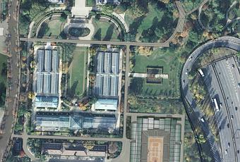 D'abord, malgré la hauteur très élevée à laquelle le photomontage de la mairie a été "réalisé", on voit bien sur le document que nous vous présentons ci-contre que le nouveau court de tennis ( c'est la toiture verte rectangulaire entre le Périph' et la grande serre, avec le terrain de tennis au milieu ) occuperait un vaste espace et serait extrêmement visible depuis presque tout le site. Cette enceinte de 5.000 places, soi-disant "partiellement enterrée" (?) ferait quand même 16 mètres de hauteur.