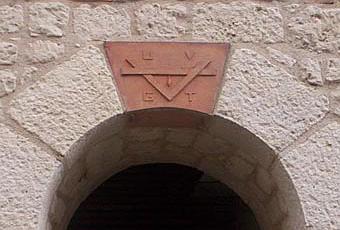De facture récente, réalisé en terre cuite, cet emblème désigne probablement la demeure d'un Compagnon du rite Soubise (lettres symboliques U V G T), mais outre l'absence du compas, l'aspect général est inhabituel. L'outil horizontal est-il une règle ou une besaigüe ? Les visiteurs du blog pourraient-ils éclairer notre lanterne ?