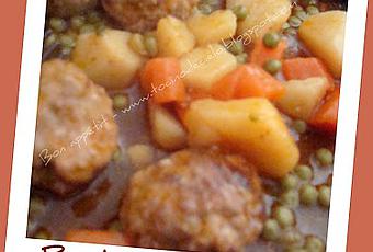 Mouiller les boulettes avec le vin blanc. Ajouter le bouillon, les carottes, les pommes de terre et la sauce tomate. Ajouter de l'eau si besoin pour mouiller un peu moins que la hauteur de la viande. Saler modérément, poivrer, ajouter 1 cuillère à café de paprika fort. Mélanger. Laisser mijoter pendant 1 h 30 à 2 h 00. Environ 15 minutes avant de servir, ajouter les petits pois égouttés.