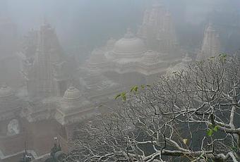 Les bouleversements meteorologiques sont partout dans le monde. En ce moment il regne un temps de mousson jamais vu encore en cette fin novembre sur le Gujarat. Aujourd'hui pas de pluie pour monter faire le pelerinage a Palitana la "Mecque" du jainisme, mais un temps de brume qui rendait le paysage irreel. Les domes des centaines de temples se dessinaient comme estompes par ces nuages bas qui les transformaient en chateau de belle au bois dormant.