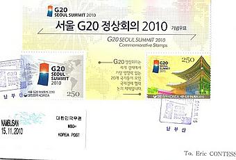 La poste coréenne a émis, le 11 novembre 2010, 2 timbres commémoratifs consacrés à ce sommet du G20 à Séoul.