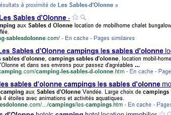 Que se passe-t-il si votre site est un portail touristique des Sables d’Olonne, ou des gîtes en marais poitevin, qui présente, entre autres, des campings ou des gîtes, et donc jouit d’un bon positionnement sur Google pour le mot clé « campings Sables d’Olonne », ou « gîtes en marais poitevin » mais n’est pas le site d’un camping, ni d’un gîte, et donc ne peut pas être référencé sur Google Maps en tant que camping ou gîte? Dans le cas du portail des Sables d’Olonne, il a littéralement sombré de la troisième à la neuvième position pour la requête « campings Sables d’Olonne ». Voir l’image ci-dessous, c’est le site lessablesdolonne.com, et sa page interne « campings » :