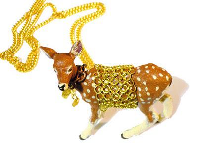 Collier "Biche ma caille" composé d'une biche en plastique (5 x 6 cm) habillée d'une maille métallique en laiton, d'une noeud en métal doré et d'une petit sequin doré. Chaîne dorée à l'or fin. Longueur totale une fois porté: 45 cm