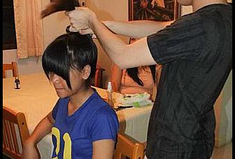 A 4h30, le coiffeur est arrivé à la maison pour coiffer et maquiller notre fille Orawan et deux de ses copines de classe. Cela a prit deux bonnes heures.