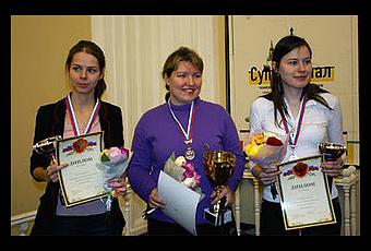 De gauche à droite, la favorite du tournoi Tatiana Kosintseva finit 3ème, Alisa Gallimova est sacrée championne de Russie 2010 et Natalia Pogonina s'adjuge la seconde place - photo © Anna Burtasova