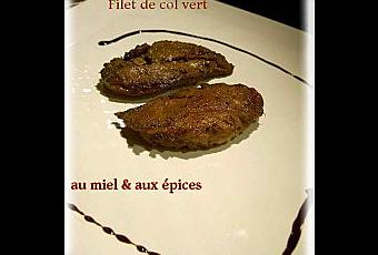 - 2 petits col vert - 1 cuillère à soupe de miel - 1 cuillère à soupe de sauce soja - 1 cuillère à soupe de vinaigre balsamique - 1 cuillère a café de cardamome en poudre - 1/2 cuillère à café de réglisse en poudre - sel poivre * Dégager les filets de col vert. (j'ai aussi désossé les cuisses pour les cuisiner de la même façon) * Les poivrer de chaque côté. * Les déposer dans un petit plat * Dans un bol mélanger la sauce soja, le miel,le vinaigre, les épices. * Verser cette préparation sur les filets et retourner les pour que toutes les faces s'imprègnent. * Préchauffer le four à 170 °. * Faire chauffer un grill et passer les magrets 2 mn de chaque côté. * Déposer les 4 magrets sur un plat à gratin et enfourner 5 mn Accompagner ce plat d'un vin rouge, par exemple un Bourgogne (Chambolle Musigny, Moret Saint Denis) ou un Bordeaux ( Moulis..)