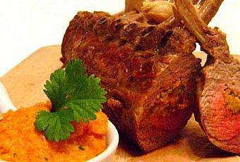 3. A l’aide d’un couteau fin, inciser le centre du carré d’agneau dans toute sa longueur. Insérer la farce préparée la veille et durcie par congélation. Préchauffer le four à 250°C.