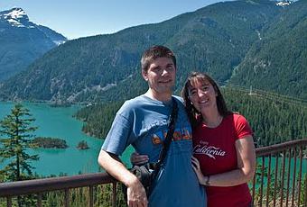 Nous deux devant un lac bien turquoise dans la chaîne des CascadesComme leur nom de l'indique pas, les North Cascades sont une chaîne de montagnes qui marque la fin d'une barrière de 1100 kilomètres de montagnes débutant dans le nord de la Californie (pas très loin des Alpes Californiennes et de Yosemite, souvenez vous !) et comportant la bagatelle de 26 volcans, dont les deux que nous sommes allés voir de près dans les articles précédents...