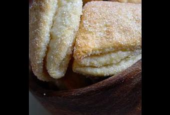 Tremper la surface supérieure dans le sucre, et déposer le biscuit, face non sucrée, sur une feuille de papier sulfurisée.