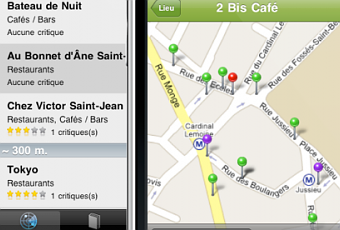 Après avoir été géolocalisé, grâce à MondeCafés, vous aurez en quelques secondes accès à des adresses de restaurants, bars ou autres. Et pour vous aider à faire votre choix, d’autres utilisateurs auront peut-être au préalable émis un avis concernant l’établissement. L’application, compatible avec l’iPhone, l’iPod touch et l’iPad, permet également de partager vos bons plans découverts directement sur Facebook ou Twitter.