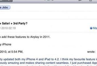 Steve jobs a répondu à un mail d’un internaute qui demandait quand est ce que l’envoi vers l’Apple TV de vidéos lues dans Safari sera possible. Steve Jobs a répondu que plusieurs fonctionnalités seront ajoutées à AirPlay courant 2011.
