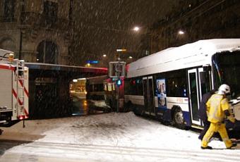 Il est 23h00, une minute avant ou une minute après, c’est un détail. Les pompiers déboulent sirènes hurlantes à la rue de Chantepoulet au niveau du restaurant Alfredo. La rue est presque déserte, quelques passants pressent le pas pour rentrer chez eux. Un premier bus dérape et heurte les feux de signalisation. Un deuxième bus juste derrière pour l’éviter fait une mauvaise manoeuvre et reste bloqué. Les pompiers sont appelés à la rescousse. Les grands moyens sont utilisés. Et le camion grue sort de la caserne pour remettre les deux bus sur le droit chemin. Pour la première fois la rue de Chantepoulet reste bloquée dans les deux sens pendant plusieurs heures. Heureusement cet incident sans gravité a lieu pendant la nuit. J’ai suivi le travaille des pompiers pendant une heure et demie mais j’ai vite abandonné la rue pour rentrer chez moi à cause du froid. Blogueur oui, suicidaire non. Quelques photos sur le travail exceptionnel des hommes du feu qui travaillent aussi quand il neige!