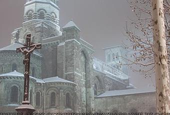 Nous sommes sous la neige. Je n'ai pu m'empêcher de prendre la Basilique Saint-Julien de Brioude en photo. Etrange ambiance restituée par cette photo. Cette vision semble irréelle. En se forçant un peu, il suffirait de laisser divaguer son imaginaire pour raconter une histoire d'un autre temps peuplée de personnages tous plus irréels les uns que les autres pour un récit qui ne le serait pas moins. Mais il fallait garder les pieds sur terre et la séance n'a duré que quelques minutes tant la neige qui tombait représentait un risque pour mon matériel. Un rare moment, court, mais intense !