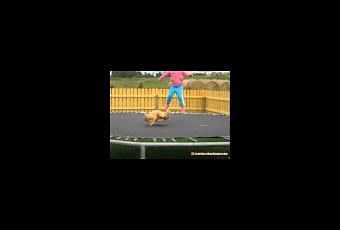 La petite fille saute sur le trampoline et l’animal se laisse rebondir en se mettant meme sur le dos .