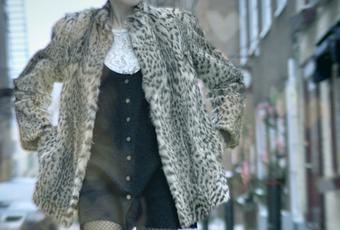Our latest mini-shoot features the very yummy vintage Ocelot fur coat, a 60′s top worn as dress (because I’m short!), thrifted lace top and vintage late 70s fringes over the knee suede boots. On my head, a 90s berret-style hat.