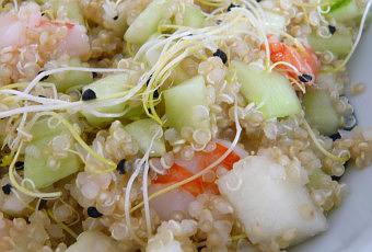 Cette fois, je me suis régalée d'une salade de quinoa avec crevettes, concombre, pomme verte, graines germées. C'était tout à fait délicieux mais je me suis promis de mettre bientôt à mon menu sarrasin, épeautre et autres graines plus locales.