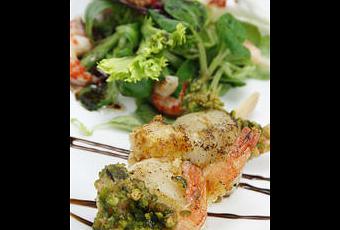 2. Sécher les St Jacques à l'aide de papier absorbant, puis préparer les brochettes en intercalant ainsi : crevette pistache - st jacques - crevette chapelure - st jacques - crevette pistache. Réserver au frais en attendant la cuisson.