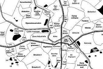 Les quartiers de BouakéSource : Paul Janin, 2001, "Une géographie sociale de la rue africaine (Bouaké,Côte d'Ivoire)", Politique africaine, n°82, p. 189.La rue est ainsi perçue comme une ressource mobilisable dans les revendications politiques. Espace de vie (voir à ce propos les travaux de la géographe Marie Morelle concernant la rue africaine ; voir également le numéro spécial "La rue" de la revue Tracés, n°5, 2004, notamment l'article d'Antoine Fleury : "La rue : un objet géographique ?"), la rue devient également un espace de mise en scène de la politique, à travers des formes aussi variée que les manifestations et les émeutes. "Les manifestations populaires ont transfiguré la rue et en ont fait l’exutoire de la protestation et de la colère. La rue s’est imposée progressivement comme un lieu d’expression politique, en dehors des procédures de vote" (Christophe Premat, 2004, "La « grogne du peuple »", Tracés, p. 13). La violence est à la fois un moyen utilisé dans cette mise en scène et une réponse sociale à une frustration vis-à-vis des décisions politiques (on se reportera à l'incontournable blog d'Alain Bertho, Anthropologie du présent, qui, en plus de fournir une base de données quotidienne exhaustive des émeutes de par le monde, propose par des textes et des vidéos une "ethnographie de la colère", par-delà les particularismes locaux qui sont souvent mis en avant dans les analyses sur les émeutes).