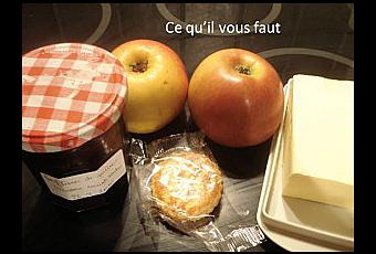. Recouvrez chacune des bases de pomme d’une cuillère de confiture de mûres et saupoudrez généreusement de miettes de palets bretons.