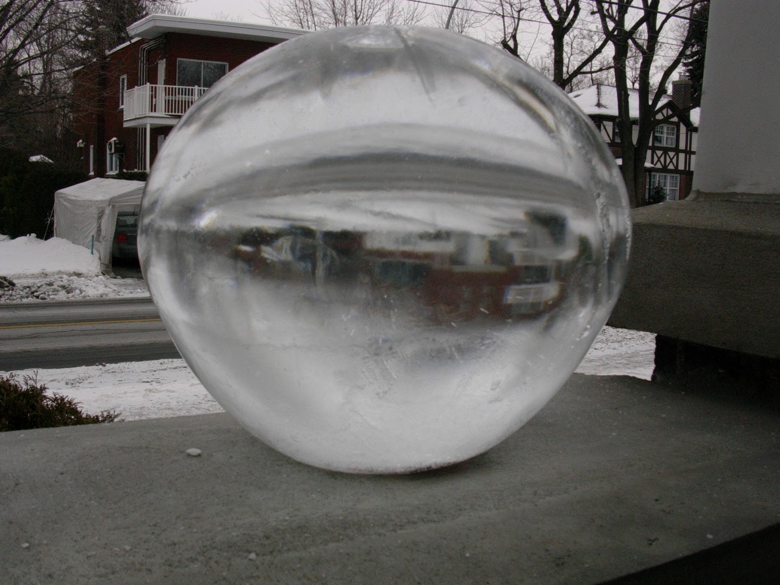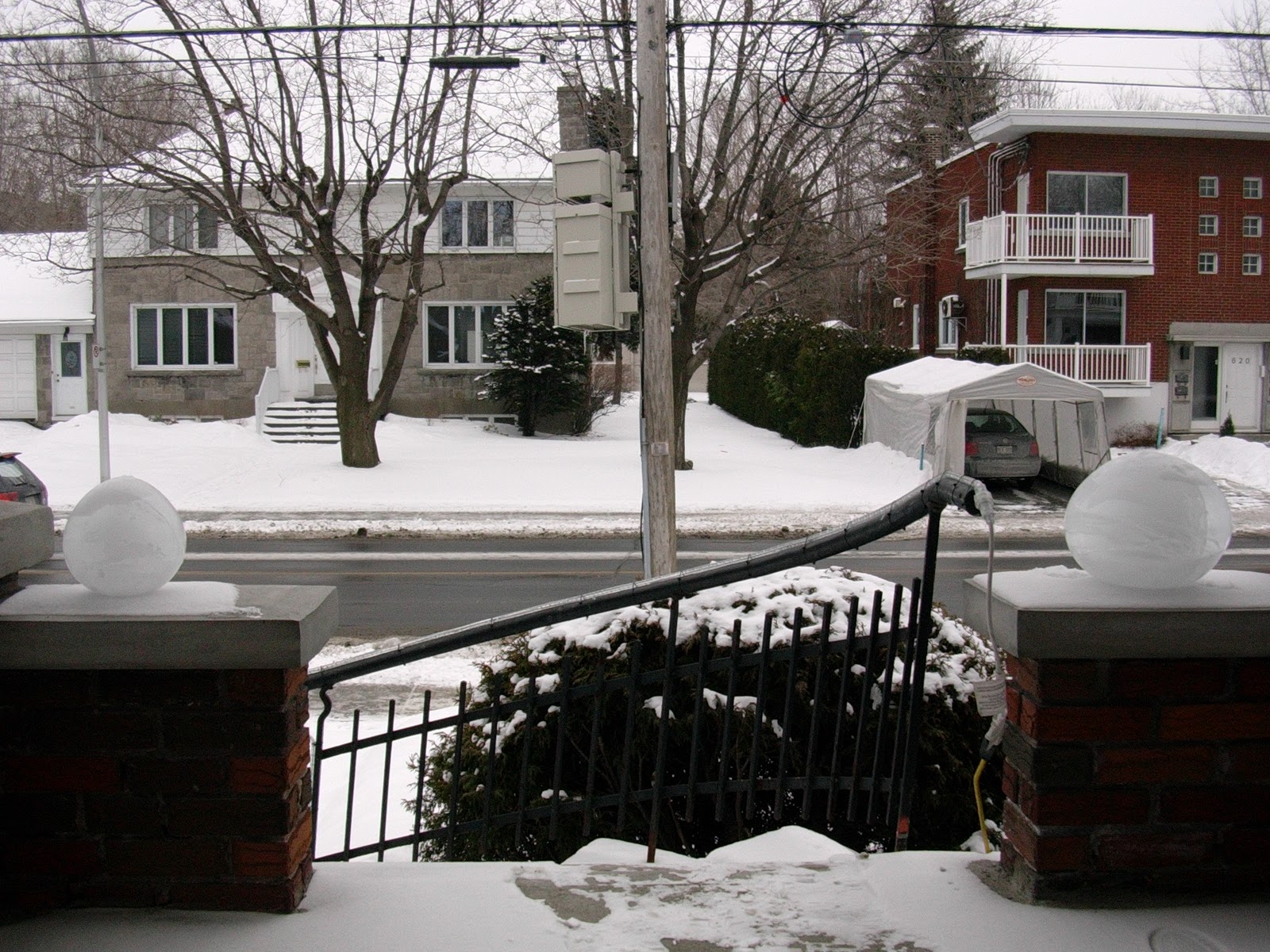 L'extérieur : boules de glace.J'adore faire ce type de décoration car c'est amusant à réaliser pour les enfants et économique. Cependant, il est préférable d'attendre de températures vraiment froides et utiliser de l'eau embouteillée si on veut obtenir une boule claire. Il est possible d'ajouter des petits objets décoratifs dans l'eau comme des perles, petites branches de sapins ou même des petites cocottes.