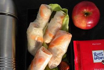 Nems porc-carotte sur feuille de salade, fraise de sauce soja,