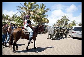 D'après la presse en espagnol, des groupes de pascuans ont envahi et occupé des terrains dont ils revendiquent la propriété "ancestrale", un peu comme le fait le Pomare parti ici à Tahiti. En réponse à ces actions qui ont débuté en juillet, la justice chilienne a accordé des titres de propriété à certaines familles sur certains terrains mais pas sur tous ceux qui étaient revendiqués. Le gouvernement chilien a envoyé les troupes pour déloger les manifestants des terrains occupés illégalement. Il s'en est suivi un échange de pierres contre fusils à balles en caoutchouc. Plusieurs blessés, dont un gravement.