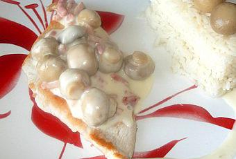 Dans une poêle faites cuire les escalopes de poulet puis y ajouter les lardons, les champignons et la crème fraiche. Laissez mijoter une dizaine de