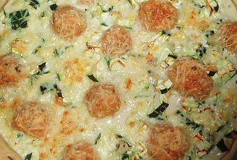 Déposer les dès de courgettes sur la pâte à tarte, puis répartir les boulettes de thon;