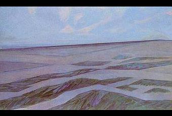 Alors reste le plaisir de voir l’évolution de la peinture de Mondrian, de la figuration à l’abstraction d’abord (c’était le tire d’une excellent exposition à la Fondation Maeght il y a 15 ans, très pédagogique, elle, autant qu’il m’en souvienne). Parmi les tableaux figuratifs, pas très nombreux, j’ai aimé ce Paysage de dunes (en haut) de 1911 où les bandes colorées du sol et les striures célestes composent une géométrie prémonitoire. Son art évolue alors entre symbolisme, fauvisme et cubisme, et l’arbre, tordu, noueux, nerveux, tragique, est un motif récurrent (Arbre rouge, 1909).