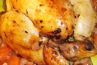 Deux jolis petits coquelets, quelques légumes, une bonne marinade, et voilà un plat délicieux!