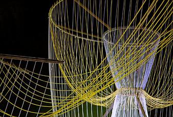 Shimmering se présente sous la forme d’un réseau de fils tressés pour former des dais et des chandeliers. Les fils caressent le vent – et non pas le contraire – et mettent l’espace en léger mouvement. Ces ondulations sont relayées par une système de capteur permettant à l’éclairage d’entrer en interaction avec le vent. Rachely déclarait sur le site d’un journal en ligne que l’installation mobilise le high-tech et le low-tech : low-tech des fils fluorescents, high-tech des capteurs anémométriques pilotant les lampes.
