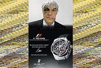 Hier a paru une publicité réjouissante dans le Financial Times et l’International Herald Tribune. On y voit la tête massacrée de Bernie Ecclestone, le grand boss de la Formule 1, mettre en avant les qualités attractives —je pèse mes mots…— des montres suisses Hublot avec une accroche suggestive : « See what people do for a Hublot » (Voyez ce que les gens peuvent faire pour une Hublot).