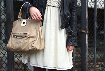 Perfecto : Zara, Robe : Paul & Joe sister, Collants : Monoprix, Chaussures : The Kooples, Sac : Gatsby Longchamp, Headband : Claire's.