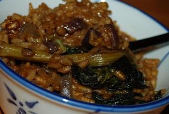 Découper l’oignon en fines lamelles. Le faire revenir avec l’huile d’olive dans un wok, puis ajouter le riz. Mélanger le riz pendant une minute jusqu’à ce qu’il ait obtenu une couleur dorée, puis baisser le feu à moyenne température. Ajouter l’eau et le miso, puis découper ce dernier en petits morceaux à l’aide d’une spatule en bois, de manière à ce qu’il se dissout plus rapidement. Ajouter la coriandre et le gingembre, puis saler le tout.