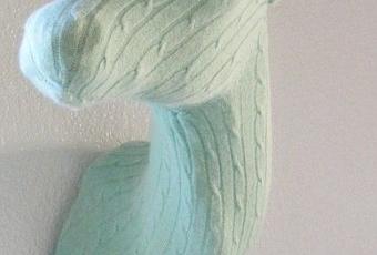 Rachel Denny l’habille d’un tricot, et voilà le trophée beaucoup plus doux et accueillant. Un mélange entre rural, cocooning et objets venus d’ailleurs !