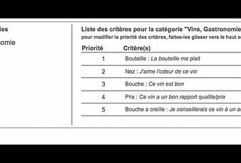 Chaque personne arrivant sur le site, recherchant une bouteille de Sancerre, mais ne sachant pas quoi prendre, peut utiliser cette grille de critères pour l'aider dans ses recherches. Il peut par ailleurs définir l'ordre d'importance de ces derniers. Qu'est-ce qui compte le plus ? Le prix, le style de bouteille... ?