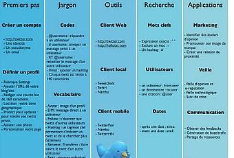 Une petite cartographie proposée par DemainLaVeille.fr pour expliquer au débutant les principaux usages et commandes de Twitter. On y trouve plusieurs colonnes : premiers pas, jargon, outils, recherche et Applications. Pour mémoire, je propose aussi un article dédié : Twitter.