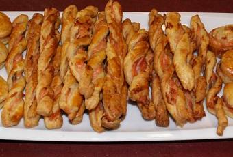 4- « tordre » les lamelles de feuilletage, les placer sur un papier beurre ou sylpat et enfourner +/- 10 minutes à 180°C.