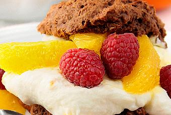 Chapeauter la garniture des parts supérieures des shortcakes, décorer de quelques fruits et d’un peu de sirop.