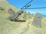 En parcourant le livre d'Hans Helfritz "Isla de Pascua" paru en 1953, j'ai eu l'idée de mesurer l'inclinaison du moaï n°269 par rapport au sol pour savoir si ce moaï risquait de tomber un jour. Le 15/11/2005, j'ai pris cette photo avec la mer en arrière plan, vue intéressante pour avoir l'horizontale incontestable. Je mesure 35° d'inclinaison sur cette photo. A la page suivante vous verrez la valeur en 1953 pour comparer.